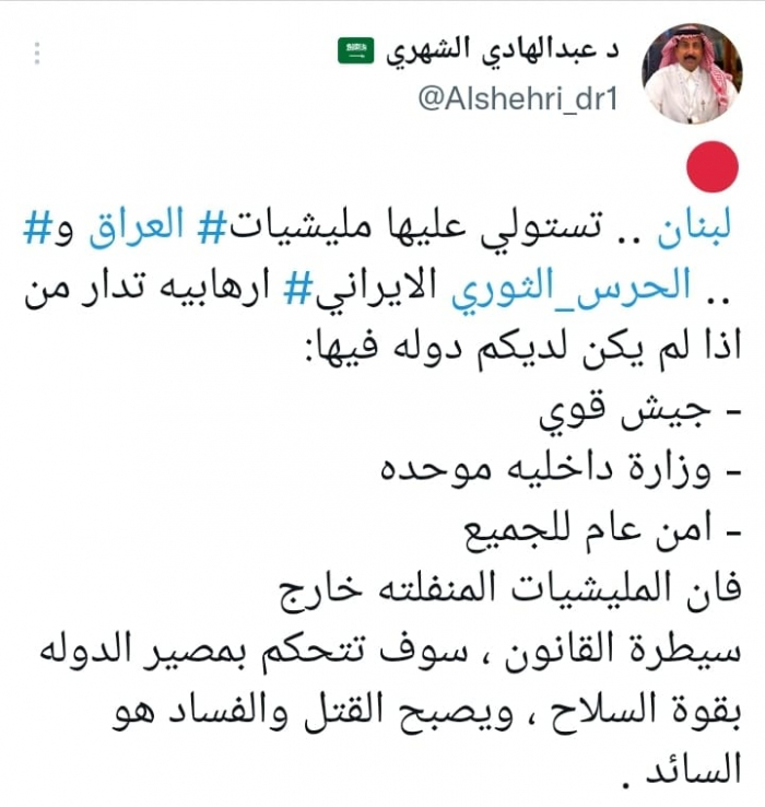 الشهري: مليشيات إيران تستولي على العراق ولبنان