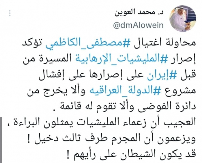 واعتبر في تغريدة على حسابه بموقع التدوين المصغر تويتر، اليوم أن: "محاولة اغتيال مصطفى الكاظمي تؤكد إصرار المليشيات الإرهابية المسيرة من قبل إيران على إفشال مشروع الدولة العراقية وألا يخرج من دائرة الفوضى وألا تقوم له قائمة".