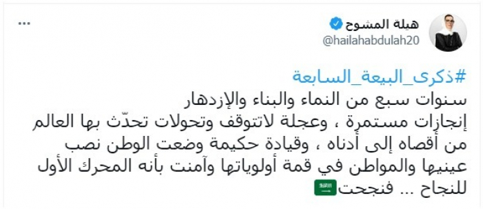 وذكرت في تغريدة عبر "تويتر"، اليوم: "سنوات سبع من النماء والبناء والإزدهار.. إنجازات مستمرة، وعجلة لا تتوقف وتحولات تحدّث بها العالم من أقصاه إلى أدناه".