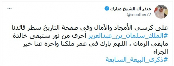 واختتم تغريدته بهاشتاج: "ذكرى البيعة السابعة".