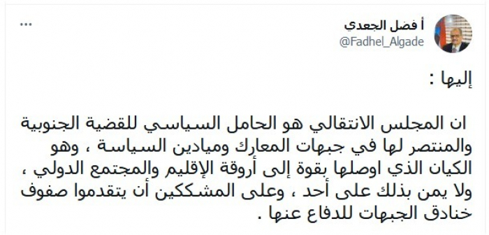 وأوضح في تغريدة عبر "تويتر"، اليوم: "أن المجلس الانتقالي هو الحامل السياسي للقضية الجنوبية والمنتصر لها في جبهات المعارك وميادين السياسة".