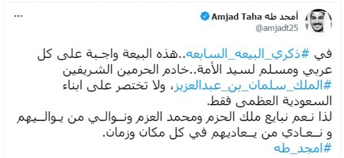 وقال في تغريدة عبر "تويتر"، اليوم: "في ذكرى البيعة السابعة.. هذه البيعة واجبة على كل عربي ومسلم لسيد الأمة.. خادم الحرمين الشريفين الملك سلمان بن عبدالعزيز، ولا تختصر على أبناء السعودية العظمى فقط".
