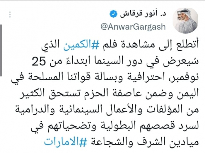 قرقاش: تخليد بطولات القوات الإماراتية في عاصفة الحزم بأعمال سينمائية