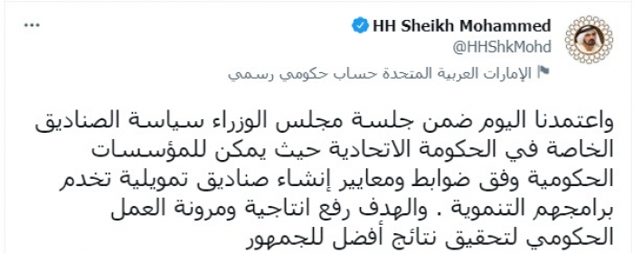 وأردف: "اعتمدنا اليوم ضمن جلسة مجلس الوزراء سياسة الصناديق الخاصة في الحكومة الاتحادية حيث يمكن للمؤسسات الحكومية وفق ضوابط ومعايير إنشاء صناديق تمويلية تخدم برامجهم التنموية".