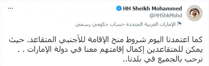 وواصل: "كما اعتمدنا اليوم شروط منح الإقامة للأجنبي المتقاعد، حيث يمكن للمتقاعدين إكمال إقامتهم معنا في دولة الإمارات.. نرحب بالجميع في بلدنا".