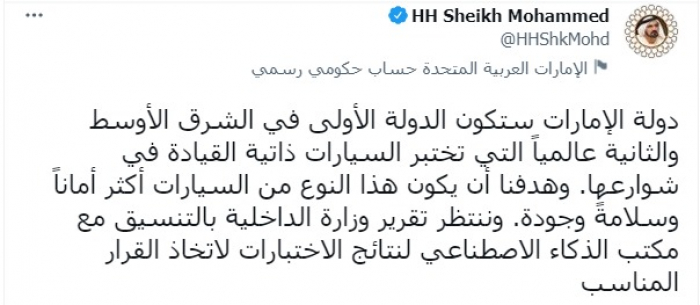 وأكد أن: "دولة الإمارات ستكون الدولة الأولى في الشرق الأوسط والثانية عالميا التي تختبر السيارات ذاتية القيادة في شوارعها".