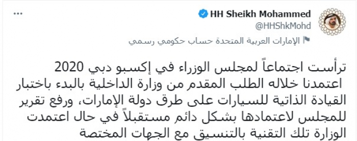 وأوضح في سلسلة تغريدات عبر "تويتر": "ترأست اجتماعا لمجلس الوزراء في إكسبو دبي 2020 اعتمدنا خلاله الطلب المقدم من وزارة الداخلية بالبدء باختبار القيادة الذاتية للسيارات على طرق دولة الإمارات".