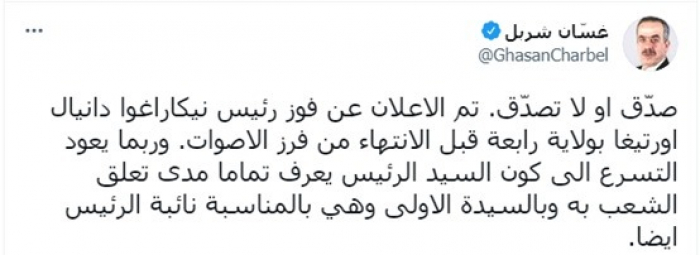 شربل يسخر من إعلان فوز رئيس نيكاراغوا قبل انتهاء الفرز