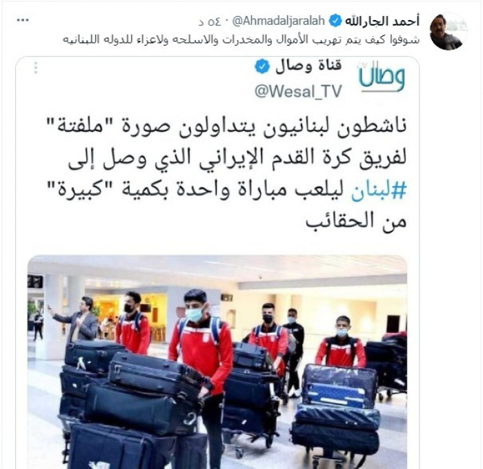 كشف عميد الصحافة الكويتية الكاتب أحمد الجارالله، أحدث حيل النظام الإيراني في تهريب الأموال والمخدرات والأسلحة إلى لبنان، بالتزامن مع تداول صور لفريق كرة القدم الإيراني، بعد وصوله إلى لبنان لخوص مباراة واحدة فقط بعدد ضخم من الحقائب الكبيرة، وسط تساؤلات وشكوك عديدة عن محتوى هذه الحقائب.