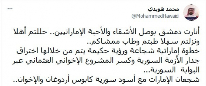 وأكد أنها: "خطوة إماراتية شجاعة ورؤية حكيمة يتم من خلالها اختراق جدار الأزمة السورية وكسر المشروع الإخواني العثماني عبر البوابة السورية".