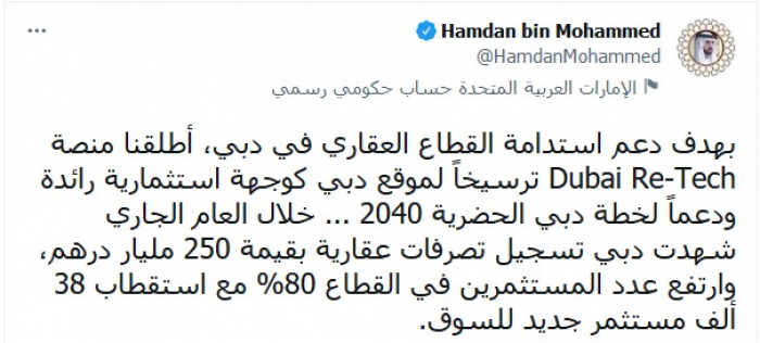 وأوضح في تغريدة عبر "تويتر"، أن إطلاق المنصة: "بهدف دعم استدامة القطاع العقاري في دبي، وترسيخا لموقع دبي كوجهة استثمارية رائدة ودعما لخطة دبي الحضرية 2040".