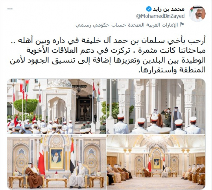 ونشر في تغريدة عبر "تويتر"، اليوم، صورا من اللقاء، وعلق عليها: "أرحب بأخي سلمان بن حمد آل خليفة في داره وبين أهله".