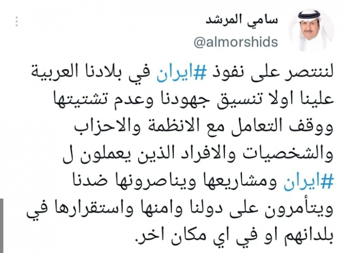 ودعا إلى: "وقف التعامل مع الأنظمة والأحزاب والشخصيات والأفراد الذين يعملون لإيران ومشاريعها ويناصرونها ضدنا ويتأمرون على دولنا وأمنها واستقرارها في بلدانهم أو في أي مكان أخر".