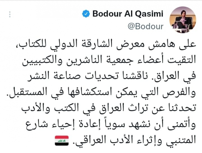 وكشفت في تغريدة على حسابها بموقع التدوين المصغر تويتر، اليوم أنه: "على هامش معرض الشارقة الدولي للكتاب، التقيت أعضاء جمعية الناشرين والكتبيين في العراق".