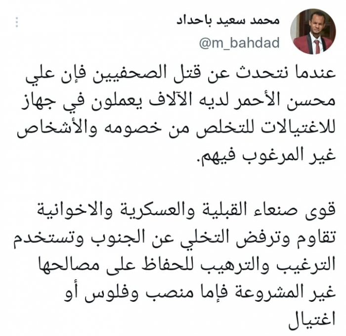 اتهم الناشط السياسي محمد سعيد باحداد، الجنرال الإرهابي علي محسن الأحمر بالوقوف خلف جرائم اغتيال الصحفيين في الجنوب.