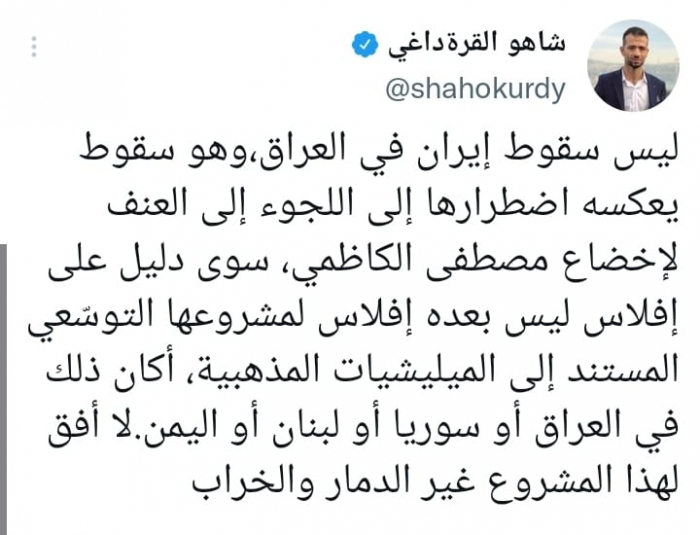 اعتبر الكاتب الصحفي شاهو قرة داغي، أن لجوء نظام ملالي طهران إلى محاولة اغتيال رئيس الوزراء العراقي دليل على إفلاس المشروع الإيراني التخريبي في المنطقة.