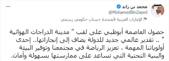 أكد الشيخ محمد بن زايد آل نهيان، ولي عهد أبوظبي، نائب القائد الأعلى للقوات المسلحة الإمارتية، أن حصول العاصمة أبوظبي على لقب مدينة الدراجات الهوائية، يعد إنجازا جديدا يضاف إلى دولة الإمارات.