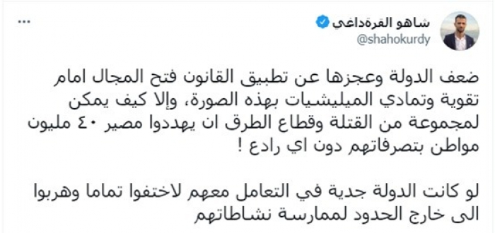 وأوضح في تغريدة عبر "تويتر"، اليوم: "ضعف الدولة وعجزها عن تطبيق القانون فتح المجال أمام تقوية وتمادي المليشيات بهذه الصورة".