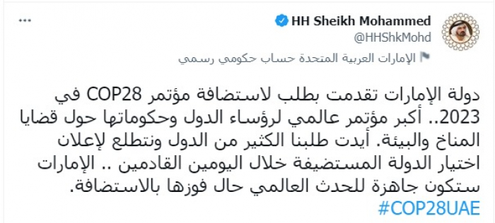أكد الشيخ محمد بن راشد آل مكتوم، نائب رئيس دولة الإمارات، رئيس مجلس الوزراء، حاكم دبي، أن دولة الإمارات العربية المتحدة، تقدمت بطلب لاستضافة مؤتمر COP28 بشأن قضايا البيئة والمناخ، مؤكدا أن الإمارات ستكون جاهزة لاستضافة هذا الحدث العالمي حال فوزها.