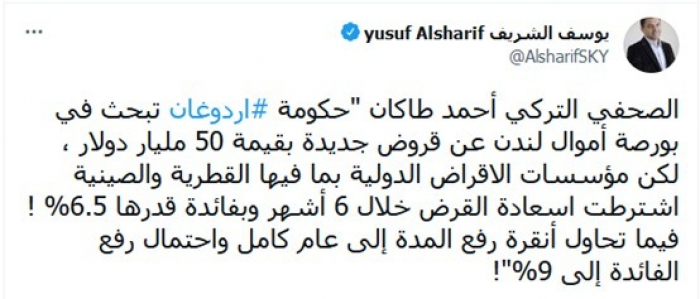 وأشار في تغريدة عبر "تويتر"، اليوم، إلى ما أعلنه الصحفي التركي أحمد طاكان: "حكومة أردوغان تبحث في بورصة أموال لندن عن قروض جديدة بقيمة 50 مليار دولار".