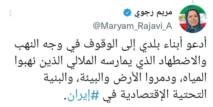 وكتبت في تغريدة على حسابها بموقع التدوين المصغر تويتر، اليوم: "أدعو أبناء بلدي إلى الوقوف في وجه النهب والاضطهاد الذي يمارسه الملالي الذين نهبوا المياه، ودمروا الأرض والبيئة، والبنية التحتية الاقتصادية في إيران".