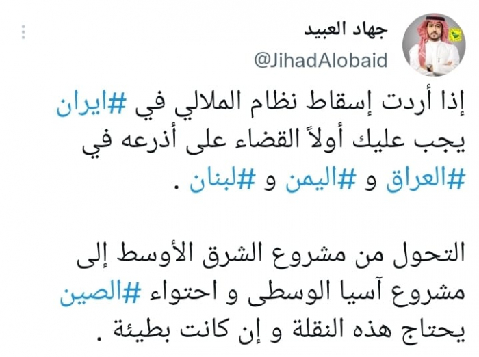 وشدد في تغريدة على حسابه بموقع التدوين المصغر تويتر، اليوم على أنه: "إذا أردت إسقاط نظام الملالي في إيران يجب عليك أولا القضاء على أذرعه في العراق واليمن ولبنان".