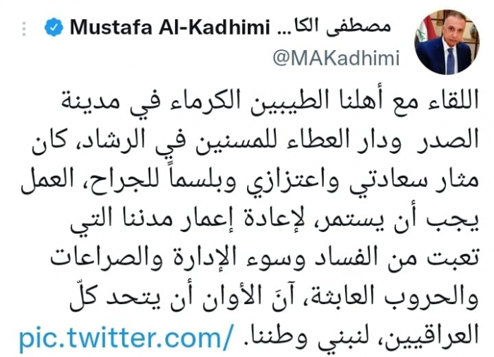 وأكد في تغريدة على حسابه بموقع التدوين المصغر تويتر، اليوم أن: "اللقاء مع أهلنا الطيبين الكرماء في مدينة الصدر ودار العطاء للمسنين في الرشاد، كان مثار سعادتي واعتزازي وبلسماً للجراح".