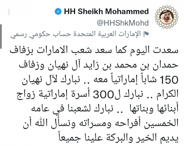 وقال في تغريدة على حسابه بموقع التدوين المصغر تويتر، اليوم إني: "سعدت اليوم كما سعد شعب الإمارات بزفاف حمدان بن محمد بن زايد آل نهيان وزفاف 150 شاباً إماراتياً معه".