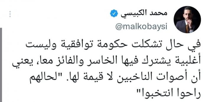 وكتب في تغريدة على حسابه بموقع التدوين المصغر تويتر، اليوم: "في حال تشكلت حكومة توافقية وليست أغلبية يشترك فيها الخاسر والفائز معا، يعني أن أصوات الناخبين لا قيمة لها"، متابعا: "لحالهم راحوا انتخبوا".