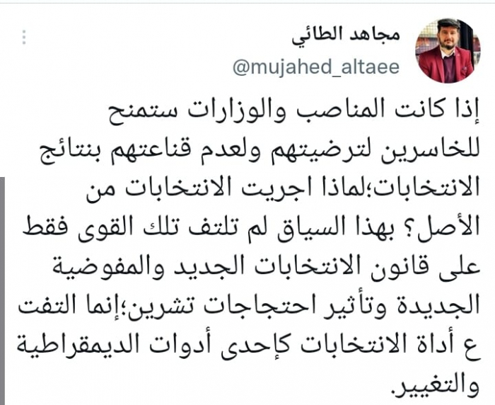 وتساءل في تغريدة على حسابه بموقع التدوين المصغر تويتر، اليوم: "إذا كانت المناصب والوزارات ستمنح للخاسرين لترضيتهم ولعدم قناعتهم بنتائج الانتخابات؛ لماذا أجريت الانتخابات من الأصل؟".