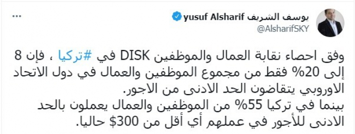 وبيّن في تغريدة عبر "تويتر"، اليوم: "في تركيا 55% من الموظفين والعمال يعملون بالحد الأدنى للأجور في عملهم أي أقل من 300$ حاليا".