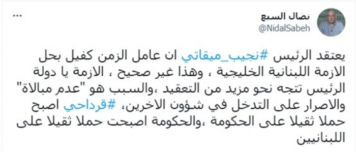 وكتب في تغريدة عبر "تويتر"، اليوم: "يعتقد الرئيس نجيب ميقاتي أن عامل الزمن كفيل بحل الأزمة اللبنانية الخليجية، وهذا غير صحيح".