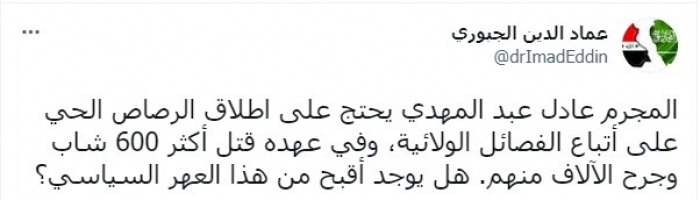 وكتب في تغريدة عبر "تويتر"، اليوم: "المجرم عادل عبد المهدي يحتج على إطلاق الرصاص الحي على أتباع الفصائل الولائية".