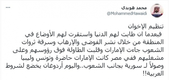 وذكر دور الإمارات: ففي مصر كانت الإمارات حاضرة وتونس وليبيا وصولا لـ سورية بجانب الشعوب.. واليوم أردوغان يخضع للشروط العربية".