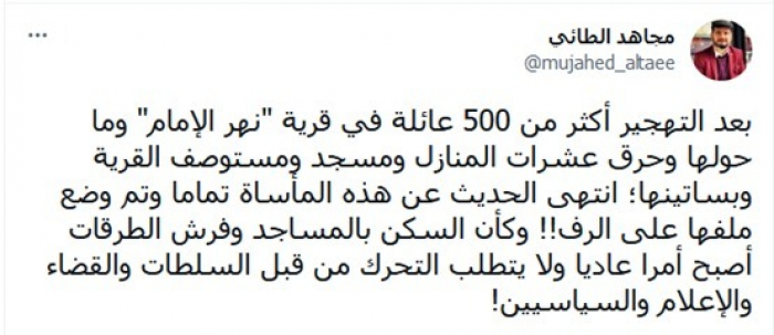 وأوضح في تغريدة عبر "تويتر"، اليوم: "بعد تهجير أكثر من 500 عائلة في قرية نهر الإمام وما حولها وحرق عشرات المنازل ومسجد ومستوصف القرية وبساتينها".