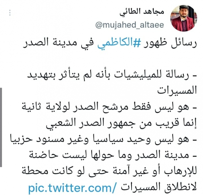 وأكد في تغريدة على حسابه بموقع التدوين المصغر تويتر، اليوم أن: "رسائل ظهور الكاظمي في مدينة الصدر: