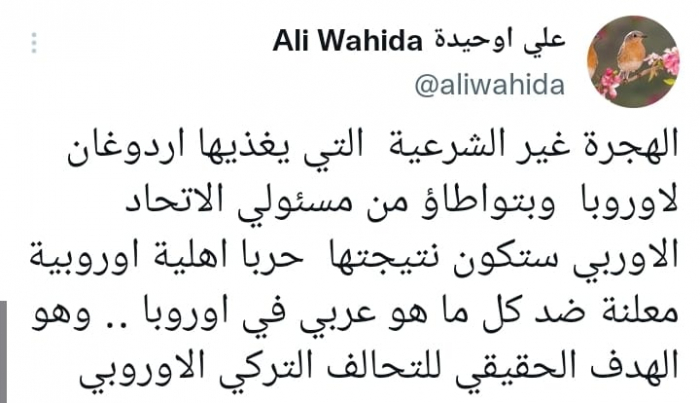 وأكد في تغريدة على حسابه بموقع التدوين المصغر تويتر، اليوم أن: "الهجرة غير الشرعية التي يغذيها أردوغان لأوروبا وبتواطؤ من مسئولي الاتحاد الأوروبي ستكون نتيجتها حربا أهلية أوروبية معلنة ضد كل ما هو عربي في أوروبا".