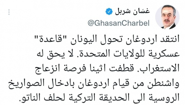 وكتب في تغريدة على حسابه بموقع التدوين المصغر تويتر، اليوم: "انتقد أردوغان تحول اليونان "قاعدة" عسكرية للولايات المتحدة، لا يحق له الاستغراب".