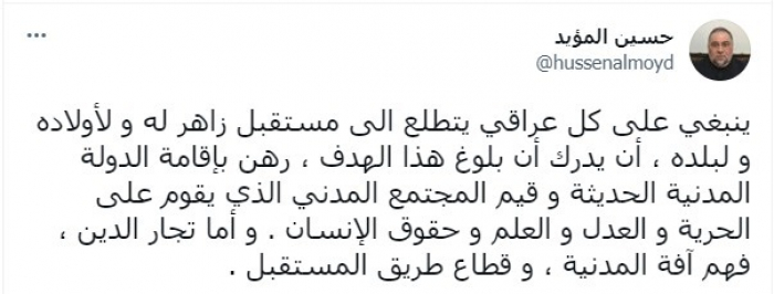 وجه الناشط السياسي العراقي حسين المؤيد، رسالة إلى الشعب العراقي تتعلق بمستقبل البلاد وإقامة دولة مدنية حديثة.