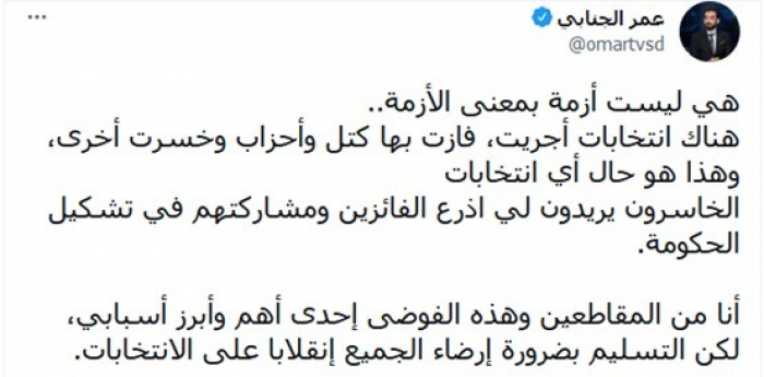 وأوضح: "الخاسرون يريدون لي أذرع الفائزين ومشاركتهم في تشكيل الحكومة"، متابعا: "أنا من المقاطعين وهذه الفوضى إحدى أهم وأبرز أسبابي"، في إشارة لعدم مشاركته في التصويت الانتخابي.