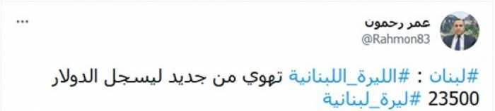 وأوضح في تغريدة عبر "تويتر"، اليوم: "الليرة اللبنانية تهوى من جديد ليسجل الدولار 23500 ليرة لبنانية".