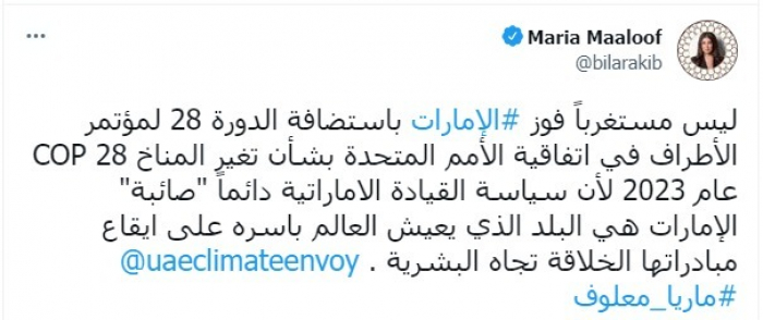 رأت الإعلامية اللبنانية ماريا معلوف، أن فوز الإمارات بتنظيم مؤتمر COP 28 عام 2023 أمر طبيعي وليس مستغربا بالتزامن مع سياسات القيادة الإماراتية الصائبة.
