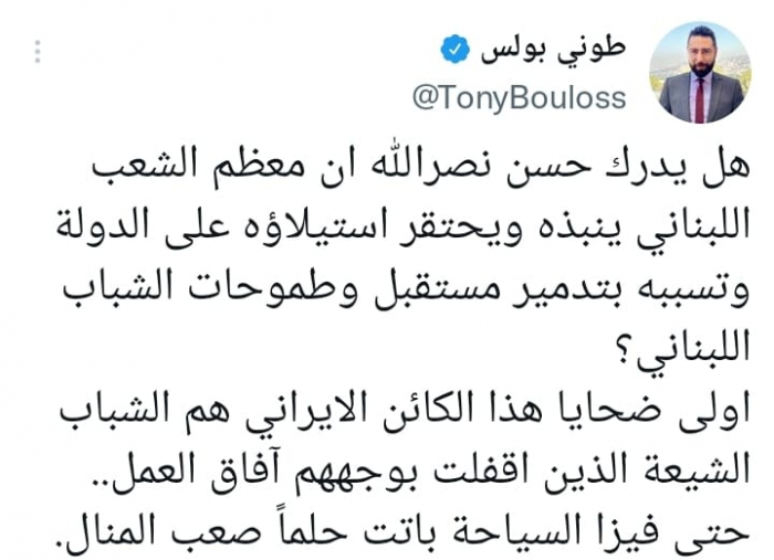 وتساءل في تغريدة على حسابه بموقع التدوين المصغر تويتر، اليوم: "هل يدرك حسن نصرالله أن معظم الشعب اللبناني ينبذه ويحتقر استيلاؤه على الدولة وتسببه بتدمير مستقبل وطموحات الشباب اللبناني؟".