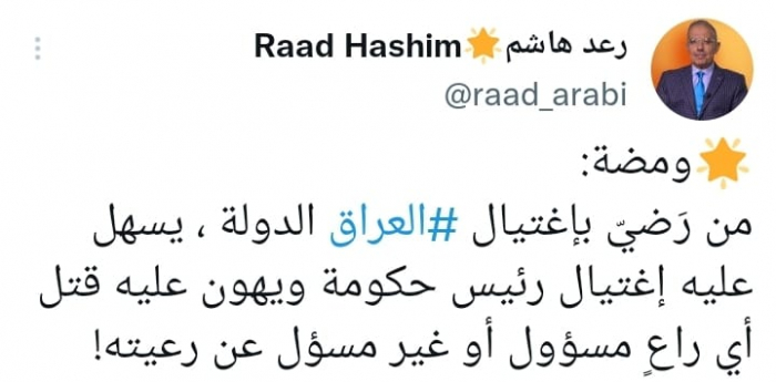 وقال في تغريدة على حسابه بموقع التدوين المصغر تويتر، اليوم إن: "من رَضيّ باغتيال العراق الدولة، يسهل عليه اغتيال رئيس حكومة ويهون عليه قتل أي راعٍ مسؤول أو غير مسؤل عن رعيته".