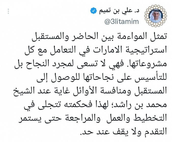 وأشار إلى أنها: "لا تسعى لمجرد النجاح بل للتأسيس على نجاحاتها للوصول إلى المستقبل"، مضيفا أن: "منافسة الأوائل غاية عند الشيخ محمد بن راشد؛ لهذا فحكمته تتجلى في التخطيط والعمل والمراجعة حتى يستمر التقدم ولا يقف عند حد".