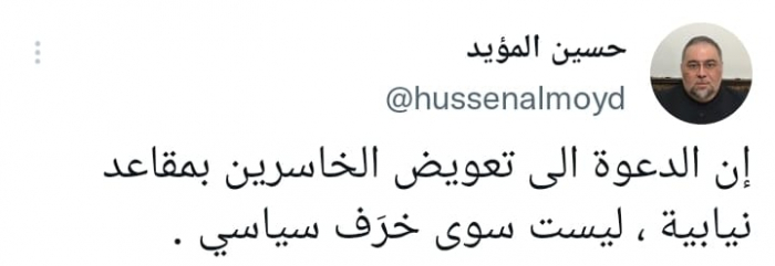 وشدد في تغريدة على حسابه بموقع التدوين المصغر تويتر، اليوم على أن: "الدعوة الى تعويض الخاسرين بمقاعد نيابية، ليست سوى خرَف سياسي".