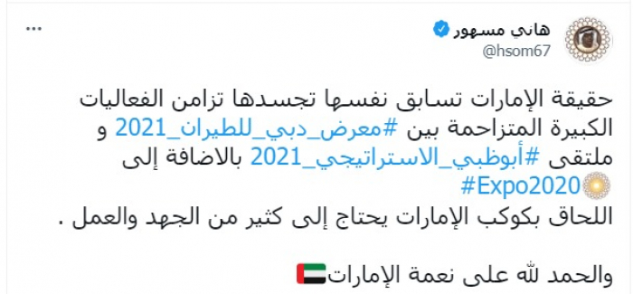 وكتب في تغريدة عبر "تويتر"، اليوم: "حقيقة الإمارات تسابق نفسها تجسدها تزامن الفعاليات الكبيرة المتزاحمة بين معرض دبي للطيران 2021 وملتقى أبوظبي الاستراتيجي 2021 بالإضافة إلى إكسبو 2020".