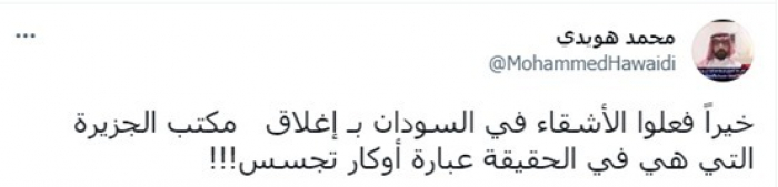 وأوضح في تغريدة عبر "تويتر"، اليوم: "خيرا فعلوا الأشقاء في السودان بإغلاق مكتب الجزيرة التي هي في الحقيقة عبارة أوكار تجسس!".