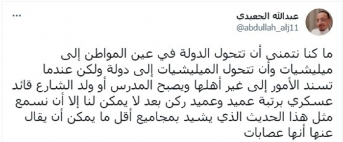 وأوضح في تغريدة عبر "تويتر"، اليوم: "ما كنا نتمنى أن تتحول الدولة في عين المواطن إلى مليشيات، وأن تتحول المليشيات إلى دولة".