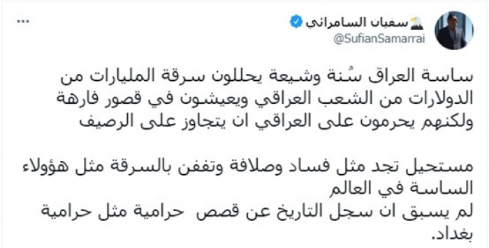 هاجم الإعلامي العراقي سفيان السامرائي، القادة السياسيين في العراق، لاستباحتهم أموال الشعب وسرقتها، مشيرا إلى أنهم مثل أعلى في الفساد.